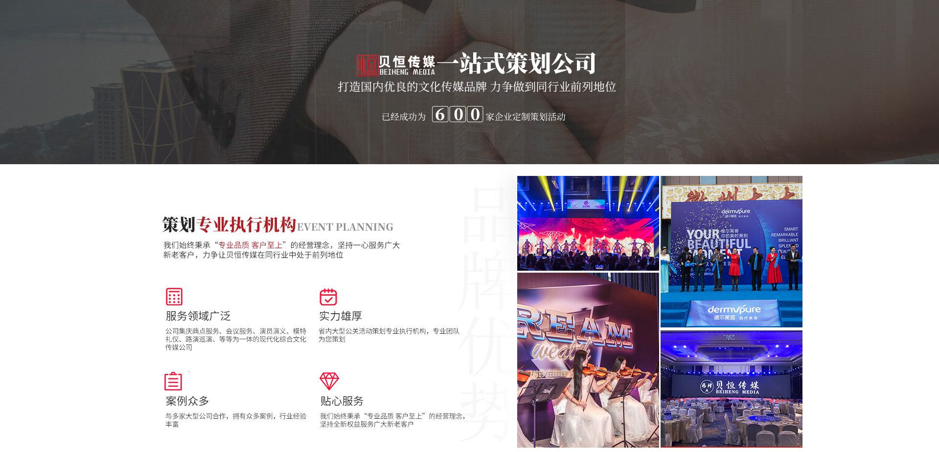 - 合 肥 貝 恒 文 化 傳 媒 專注·專業(yè)·專心·效率 合肥貝恒文化傳媒有限公司2017年成立于安徽·合肥,是省內大型公關活動策劃專業(yè)執(zhí)行機構,公司集慶典服務、會議服務、演員演藝、模特禮儀、路演巡演、展會特裝、廣告制作、設備租賃、舞美策劃、企業(yè)形象宣傳等為一體的現代化綜合文化傳媒公司,我們始終秉承“專業(yè)品質客戶至上”的經營理念,堅持全...